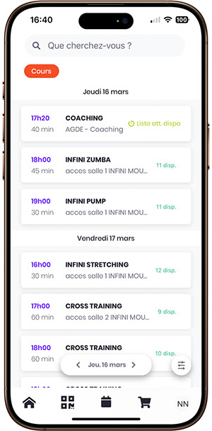 Infini Mouv propose un large choix de cours collectifs encadrés par des coachs diplômés. Chaque séance est pensée pour progresser, se dépasser et rester motivé toute l’année. Les cours sont accessibles sur réservation via l’application Xplor Active (code centre : infinimouv).